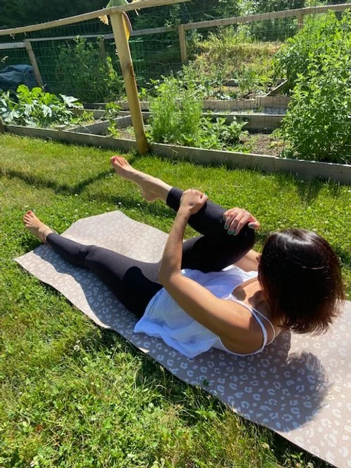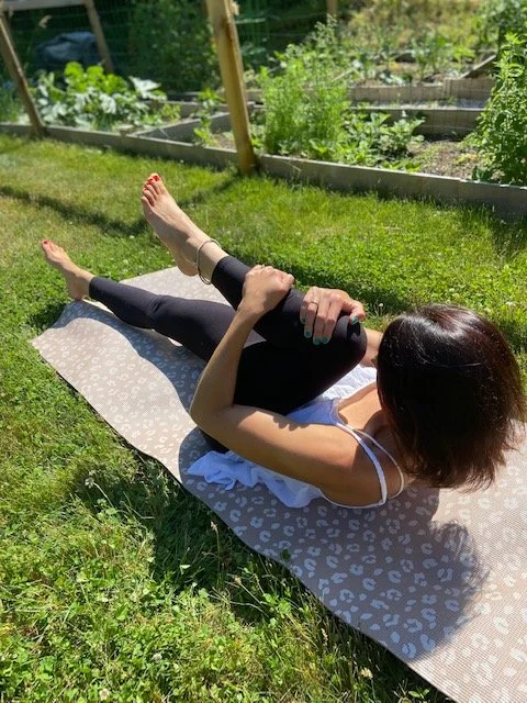 Hug one knee in and lift your nose to meet the knee, switch between legs. You may lower one leg down for low impact or hover for more of an ab strengthening exercise. Switching each time, inhale as you bring the knee in, exhale as you extend the opposite leg out and continue to switch back and fourth for 10 rounds.
