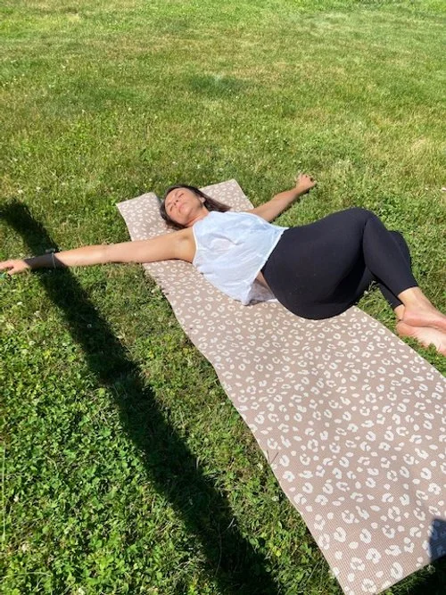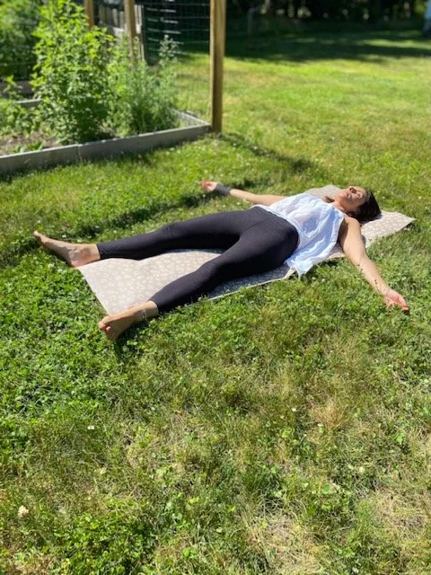 Lying flat on your mat with legs a bit wider than hip distance and the arms out to the sides, breathe here and rest for several minutes.