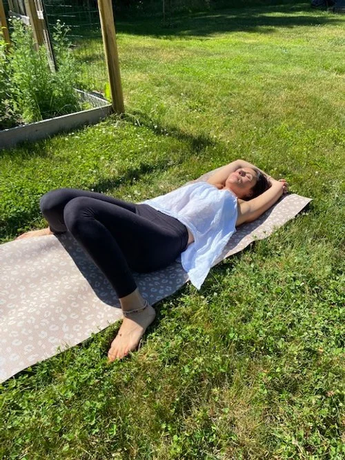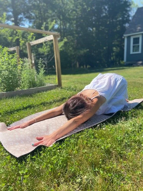 Step the feet to the outer edges of your mat and allow the knees to fall into one another. Reach the arms up over head and hold onto opposite elbows. Long deep breathing here as you allow the spine to sink into the earth.