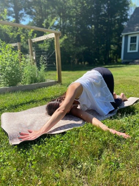 Bring the knees together or send them apart and lower the upper body down. The arms may be stretched out above towards the top of your mat, or down by your sides, perhaps holding the soles of your feet. Breathe here for several rounds. Allow each exhale to soften you deeper into the pose, surrender.
